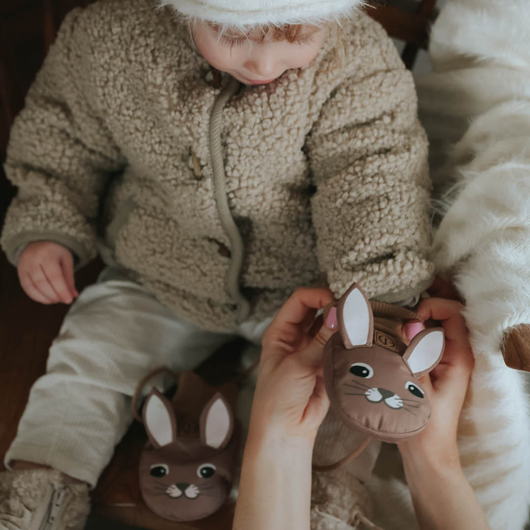 These mittens are available in two sizes. The smaller size is thumb-less and feature a cotton drawstring between the two mittens that ensure they don’t get lost and a large cotton rib that helps keep them on.