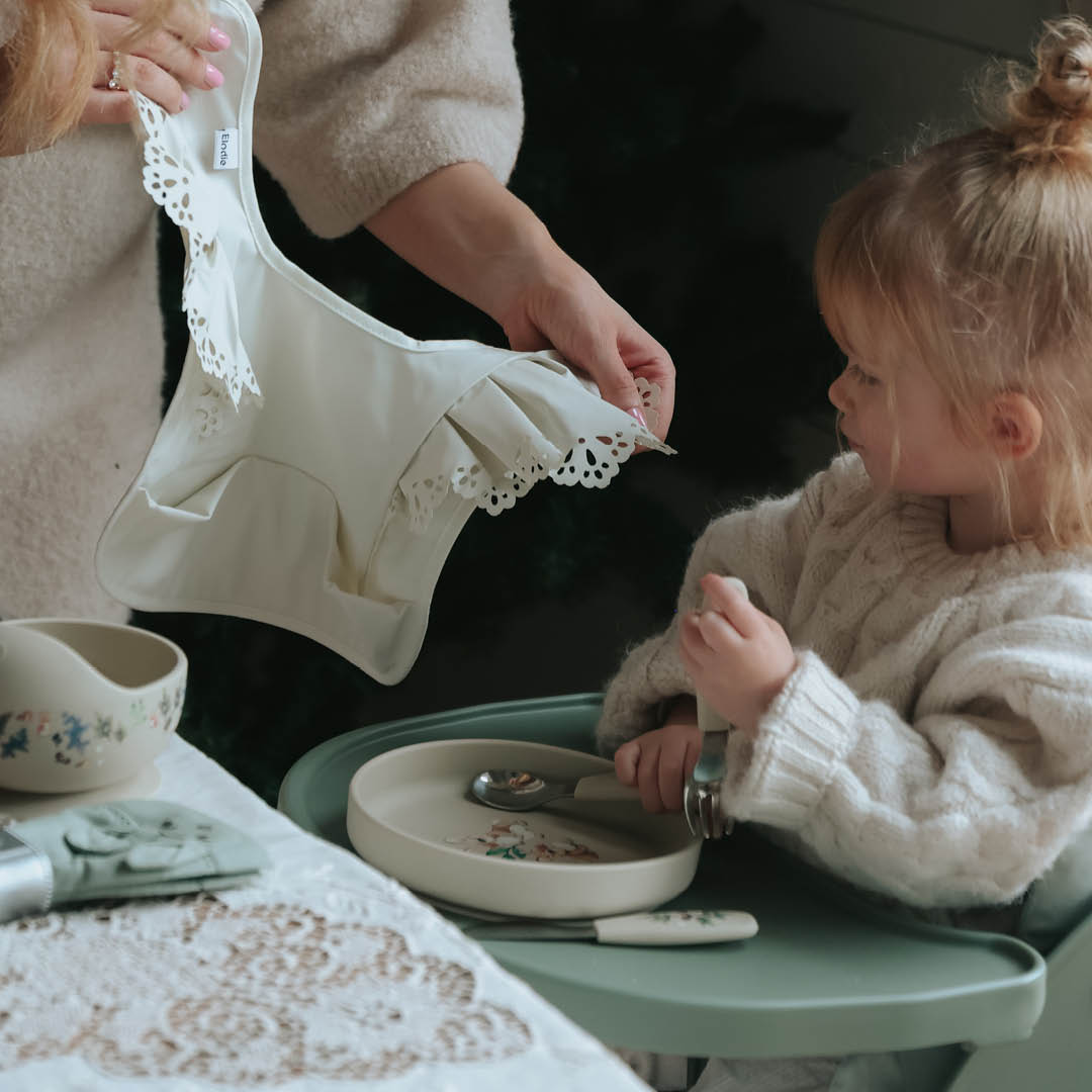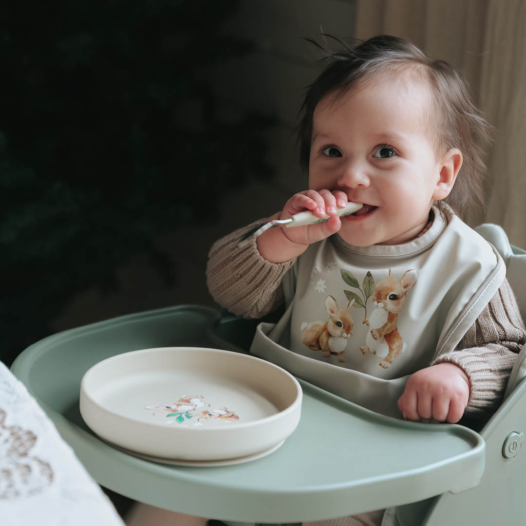 This beautiful set for first-time eaters is made with BPA-free, food grade silicone. It will last for years even if it gets dropped or even thrown to the floor every day. The chunky handles on the knife and fork give tiny hands a good grip, and the raised edge design of the plate encourages self-feeding from your toddler. The smart suction ring lets the plate stick to any flat surface.