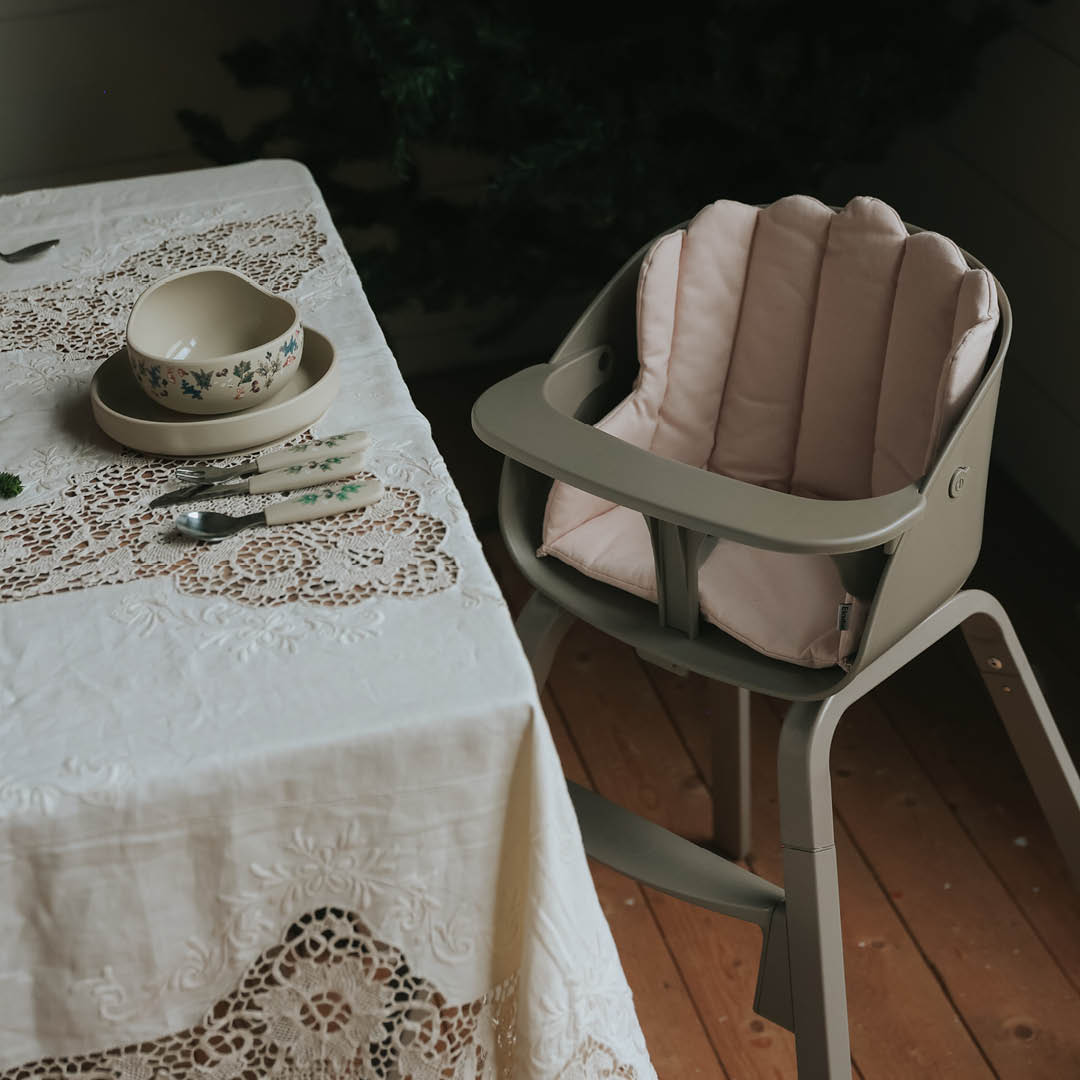 Naturally, the high chair can be complemented with a variety of beautifully designed accessories from Elodie. We offer a range of stylish cushions, as well as plates, bowls, cutlery, and of course, designer bibs— all available in coordinated shades and colors. Create your own personal style!