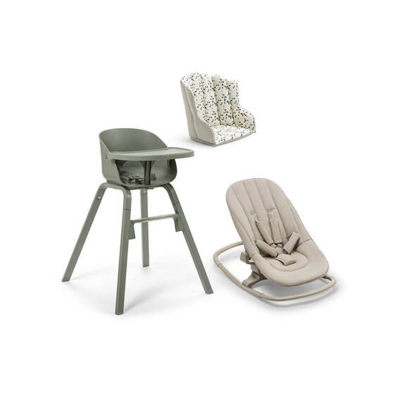 With a design rooted in Scandinavian minimalism and functionality, this set grows with your child – starting as a cozy bouncer on the floor, transitioning to a newborn seat attached to the high chair for shared family meals, and eventually becoming a modern, space-efficient high chair for toddlers and children up to 6 years old.