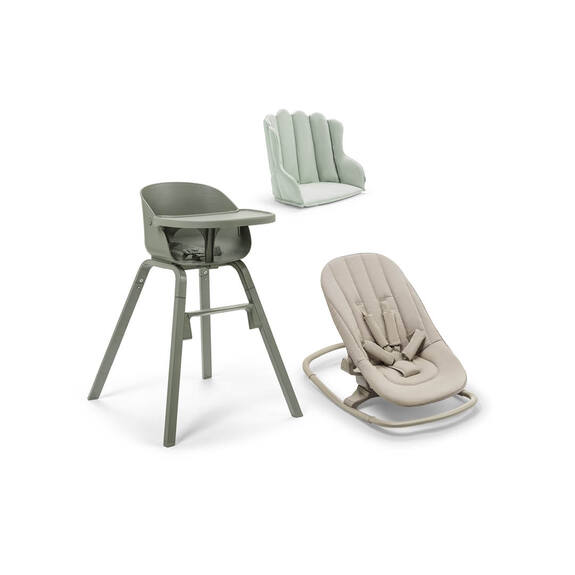 With a design rooted in Scandinavian minimalism and functionality, this set grows with your child – starting as a cozy bouncer on the floor, transitioning to a newborn seat attached to the high chair for shared family meals, and eventually becoming a modern, space-efficient high chair for toddlers and children up to 6 years old.